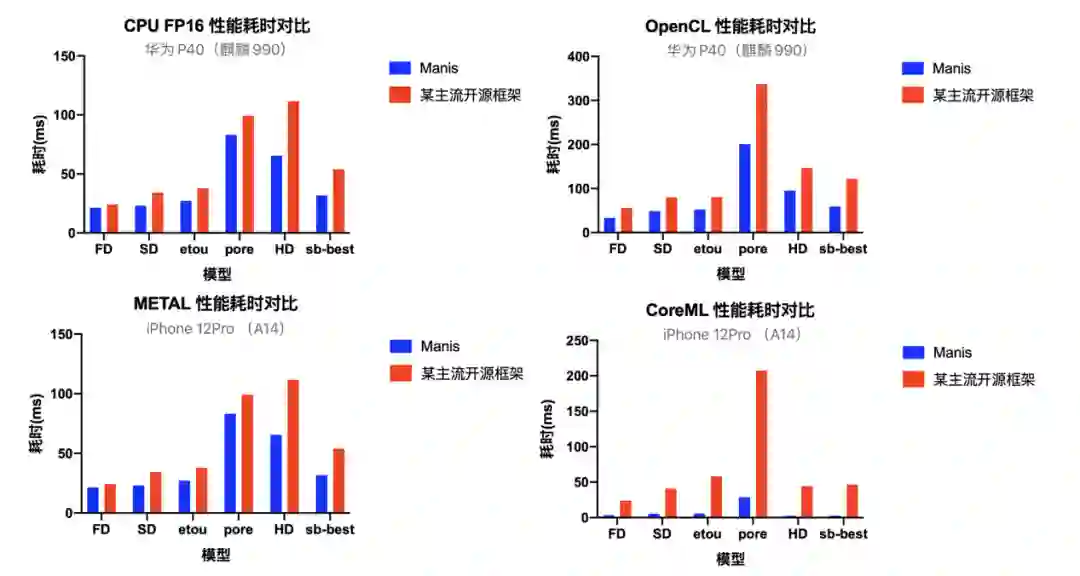 基于 Manis 的模型优化是视频美化算法得以顺利落地的核心环节,与此同时 Manis 还在美图产品应用场景中扮演着更为重要的角色。它既实现了移动端上极致性能优化,还服务于加速 AI 项目的落地生态打造。通过与主流开源框架的性能数据对比(如图 8),可以很明显地感受到 Manis 所具备的高水平推理能力与性能提升能力。