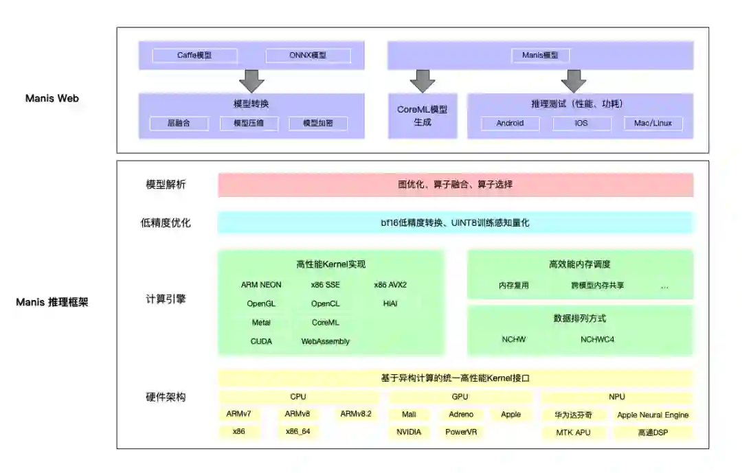 Manis 高度适配 CPU、GPU、DSP、NPU、ANE、APU 等多种硬件设备,其中 GPU 支持 OpenGL、OpenCL、Metal、CUDA 等多种技术方案,CPU 支持 fp32、fp16、bf16、int8 等多种精度方案。