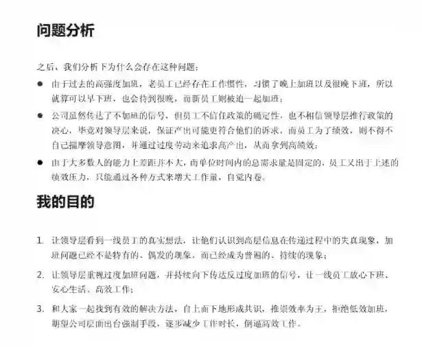 该应届生员工随后在一个内部 600 人大群里实名表达了不满,认为该表彰是变相鼓励加班,质疑管理者在进行任务排期时,只顾进度而忽略开发人员因连续加班会影响身体健康的问题。随后他也在文档中再次强调了自己的目的: