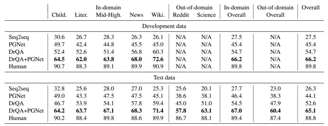 表 6 列出了模型在开发数据和测试数据上的结果。根据测试集上的结果,seq2seq 模型表现最差,有些答案不管有没有出现在段落中,都会频繁出现,这是一种众所周知的对话模型行为(Li et al., 2016)。PGNet 通过关注文章中的词汇来缓解反应频繁的问题,优于 seq2seq 17.8 个百分点。然而,它仍然落后于 DrQA 8.5 个百分点。原因可能是 PGNet 在回答问题之前必须记住整个段落,而 DrQA 避免了这项巨大开销。但 DrQA 在回复自由形式答案的问题时不理想(参见表 7 中的 Abstractive 行)。当 DrQA 被输入 PGNet 时,我们授权 DrQA 和 PGNet - DrQA 生成自由形式的答案; PGNet 专注于参照而不是段落。这种组合比经典 PGNet 和 DrQA 模型分别要强 21.0% 和 12.5%。