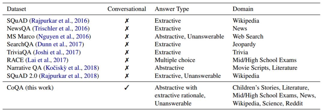 表 1:CoQA 与现有大型阅读理解数据集的比较(约 10 万多个问题)。