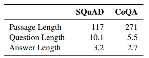 表 3:SQUAD 和 CoQA 中段落、问题和答案的平均单词数。