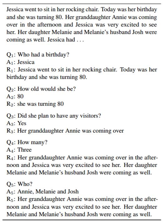 图 1:CoQA 数据集中的一个对话。每个回合都包含一个问题(Qi),一个答案(Ai)和支持答案的理由(Ri)。
