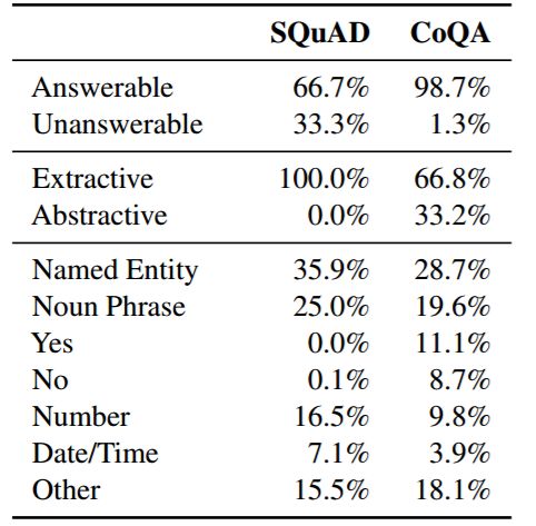 表 4:SQuAD 和 CoQA 中答案类型的分布。