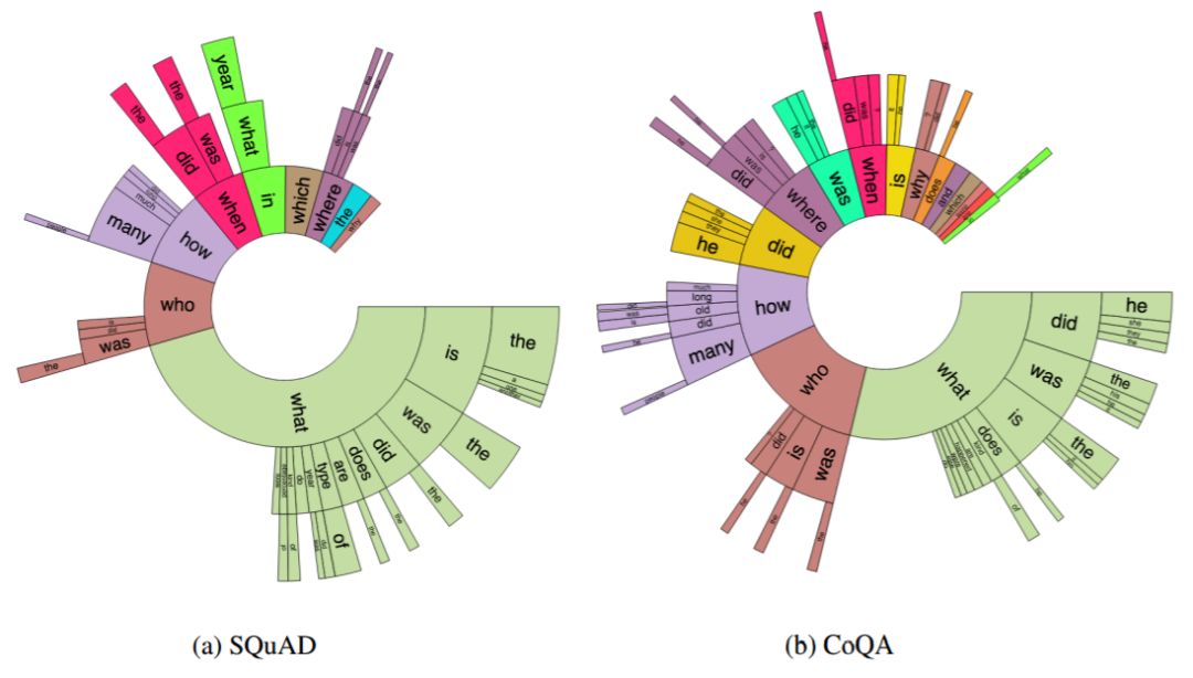 图 3:SQUAD 和 CoQA 里问题中前三个词的分布情况。