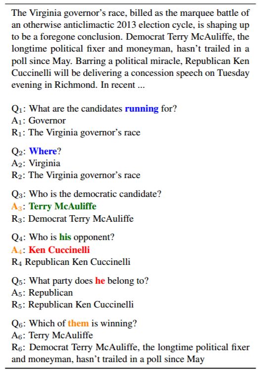 对于图 2 中的示例,对话从问题 Q1 开始。我们根据段落中的依据 R1 用 A1 回答 Q1。在这个例子中,回答者只写了 Governor 作为答案,但选择了很长的依据——「The Virginia governor’s race」。