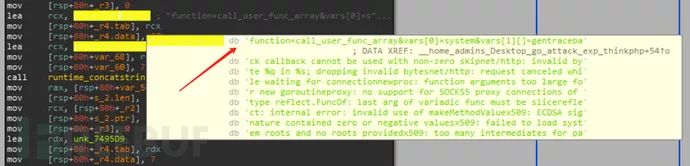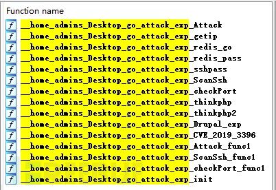 对该样本进行反汇编,可以清晰地看到漏洞攻击对应的函数,其中Attack函数是主函数,依次调用getip和checkPort,来搜索同网段在线的主机IP,以及其开放端口,若发现有22、6379端口开放,则对其进行弱密码爆破;若发现有80端口,则对其进行漏洞扫描及攻击。