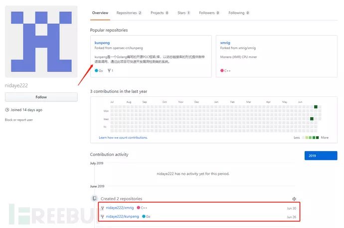 使用搜索引擎搜索nidaye222,可以发现,发布者在14天刚创建了个github账户,而在6月26号和30分别fork了漏洞扫描器kunpeng和开源挖矿xmrig,看来这个蠕虫的作者很有可能是从这得到了启发。