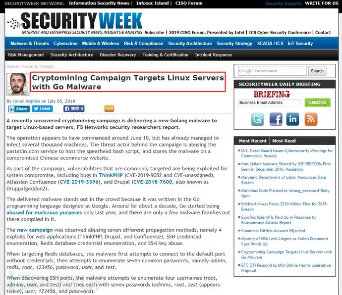 近日,国外安全网站SECURITYWEEK披露,一款Go语言恶意软件正大量感染Linux服务器,其使用了多达6种传播感染方式,包含4个远程执行漏洞(ThinkPHP、THinkPHP2、Dural、Confluence),2个弱密码爆破攻击(SSH、Redis)。深信服安全团队对该蠕虫进行了追踪。
