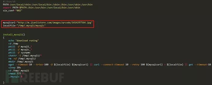 解密后可以看见其主要操作,将m.jianlistore.com/images/qrcode/1414297564.jpg保存为本地的/tmp/.mysqli/mysqlc并执行,这个文件之前已经有文章分析过了,不再累赘:https://www.freebuf.com/articles/terminal/206170.html。