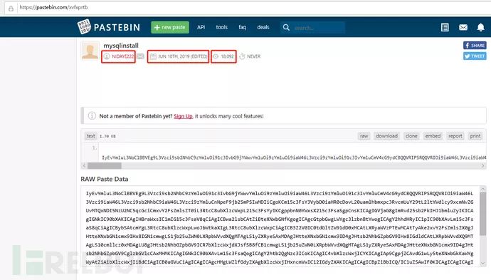 回到刚刚的网址:pastebin.com/raw/xvfxprtb,对其进行追踪,将网址中的raw去掉,就可以看到该代码的发布者了,从下图中可以得知,该作者为NIDAYE222,代码是6月10号上传的,访问量迄今为止为18000+,说明该蠕虫的感染量大概也是这个数,感染数量也还在极速上升。