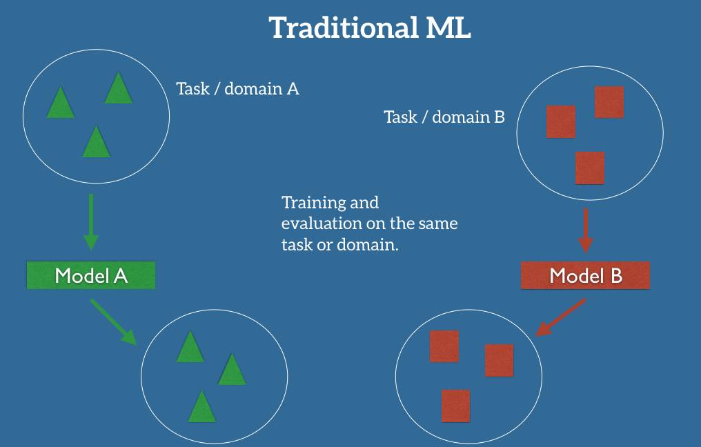 现在我们可以在这个数据集上训练一个模型 A,并期望它在同一个任务和域中的未知数据上表现良好。在另一种情况下,当给定一些任务或域 B 的数据时,我们还需要可以用来训练模型 B 的有标签数据,这些数据要属于同一个任务和域,这样我们才能预期能在这个数据集上表现良好。