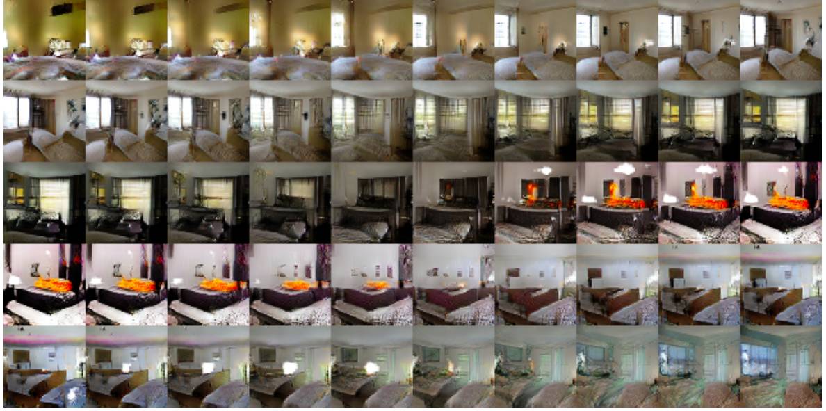 一个类似的假设被用来推动生成模型:当训练一个生成模型的时候,我们假设生成逼真图像的能力需要对图像隐含结构的理解,它反过来可以被用在很多其他任务中。这个假设本身也依赖一个前提,即所有图像都由一个低维度的流形结构决定,这就是说,可以用一个模型来抽象出图像的隐含结构。利用生成对抗网络来生成逼真图片的最新进展揭示,这种模型或许真的存在,如图 16 所示,卧室空间的点之间的逼真过渡证明了这个模型的能力。
