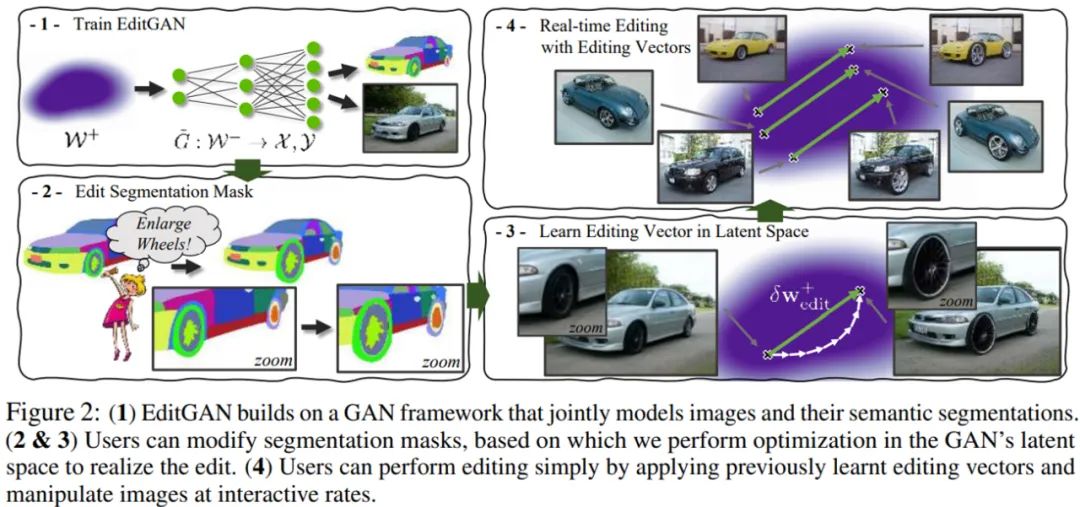 下图 2(1)为训练 EditGAN 的流程;图 2(2&3)分别为编辑分割掩码和利用编辑向量的实时编辑,其中用户可以修改分割掩码,并由此在 GAN 的隐空间中进行优化以实现编辑;图 2(4)为在隐空间中学习编辑向量,用户通过应用以往学习到的编辑向量进行编辑,并可以交互式地操纵图像。