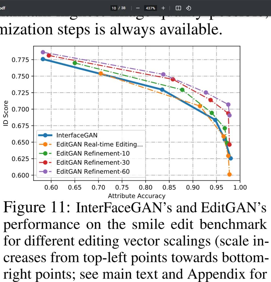 在下图 11 中,研究者展示了与 InterFaceGAN 比较的更多细节,其中应用了具有从 0 到 2 不同尺度系数的笑脸编辑向量。当编辑向量尺度较小时,身份分数高但笑脸属性分数低,这是对原始图像修改最小化导致的。他们发现,使用编辑向量的实时编辑效果可以媲美 InterFaceGAN。