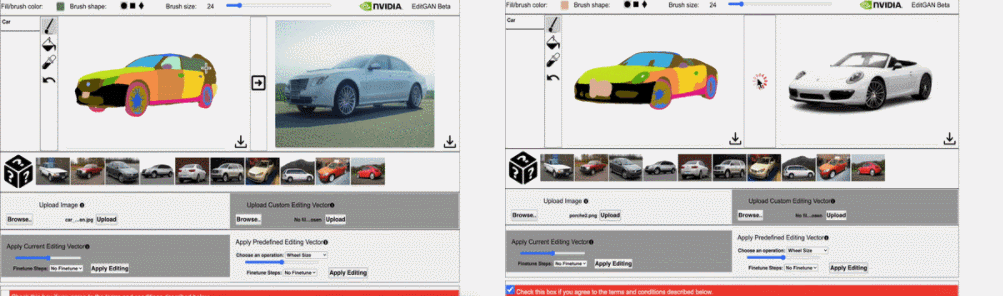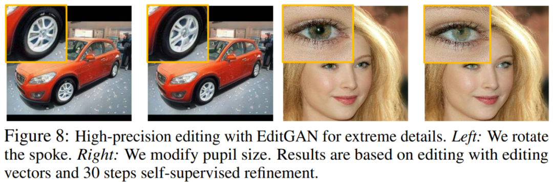 如下图 8 所示,使用 EditGAN,研究者甚至可以实现极高精度的编辑,例如旋转汽车的轮辐(左)或者扩大人的瞳孔(右)。EditGAN 可以对那些像素极少对象的语义部分进行编辑,同时还能实现大规模的修改。