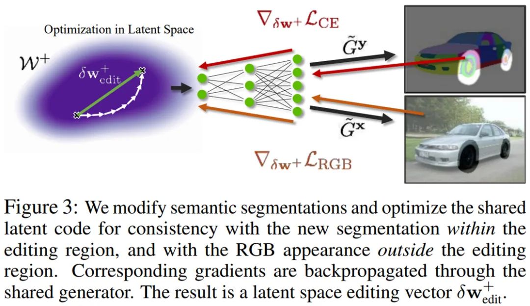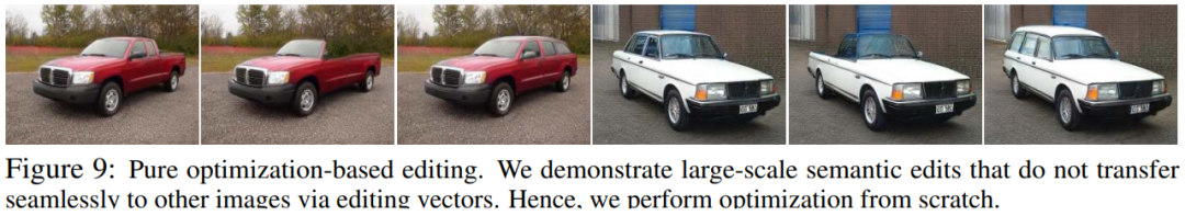 在下图 9 中,研究者展示了仅通过修改分割掩码和优化即可以去除汽车的车顶或将其改装成旅行车。值得注意的是,通过一些编辑操作生成的图像与 GAN 训练数据中出现的图像不同。