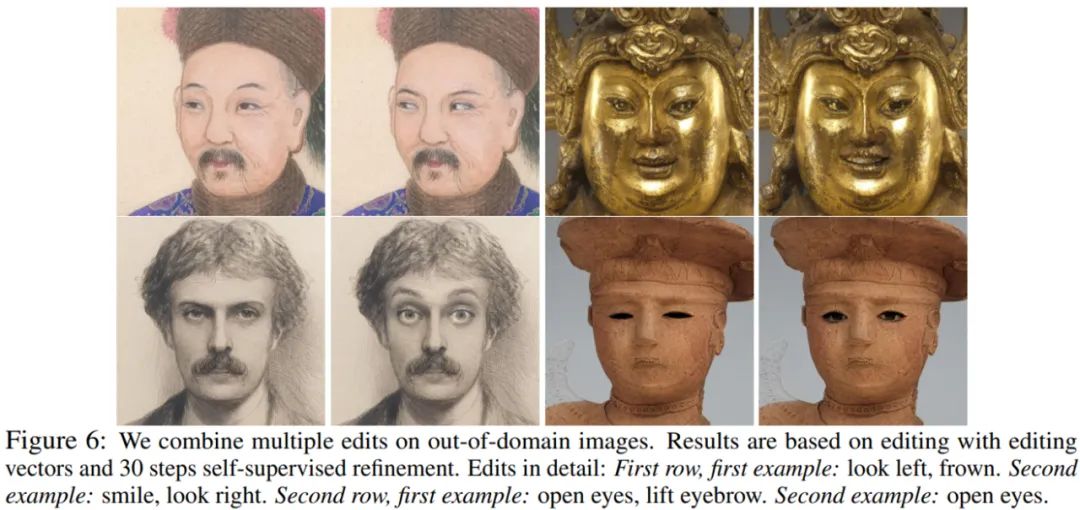 接着嵌入域外 MetFaces 肖像(使用 100 steps 的优化),再通过 30 steps 的优化应用编辑向量。