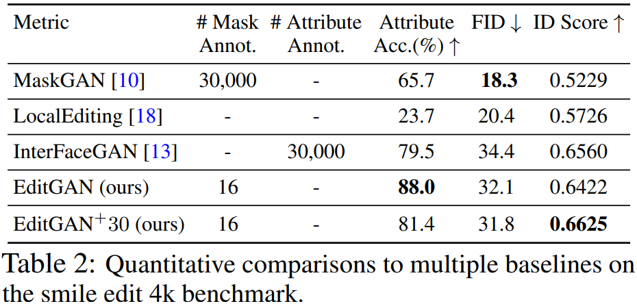 为了展示 EditGAN 的图像编辑能力的定量评估结果,研究者使用了 MaskGAN 引入的笑脸编辑(smile edit)基准。中性表情的人脸被转换为笑脸,并使用以下三项指标对性能进行度量,它们分别是: