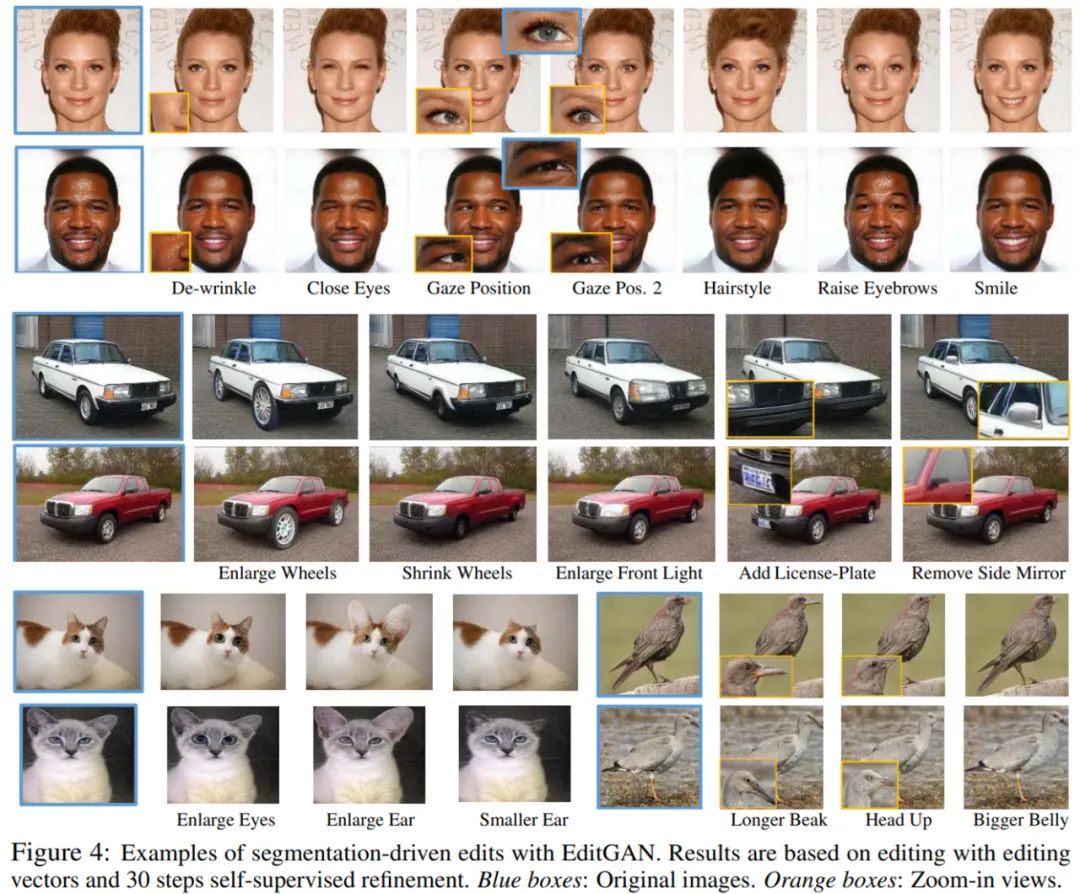 当仅基于优化或通过学习编辑向量完成编辑时,研究者通常使用 Adam 执行 100 steps 的优化。对于汽车、猫和人脸,他们使用 DatasetGAN 测试集中的真实图像,使用这些非 GAN 训练数据的图像是为了验证编辑功能;对于鸟,他们在 GAN 生成的图像上展示编辑功能。