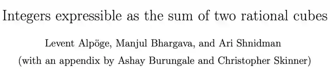 就在 10 月下旬发表的一篇论文中,三位数学家 Levent Alpöge、Manjul Bhargava 和 Ari Shnidman 证明了至少有 2/21(约 9.5%)和最多 5/6(约 83%)的整数可以写成两个分数的立方之和。值得一提的是,论文作者之一 Manjul Bhargava 在 2014 年因其对椭圆曲线研究做出的贡献而获得菲尔兹奖。