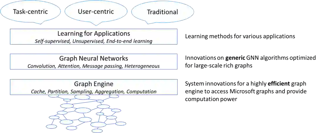 2019年底,在微软亚洲研究院院长周礼栋的协助下,白静团队主导并在微软公司内部成立了图神经网络工作组,为公司提供了一个从研究到产品的全局视野平台,以及和图学习相关的工具、算法,便于研究、产品、工程团队的跨部门协作、沟通和知识共享,从而提升图学习效率,促进系统和算法的研究创新。这一工作组的构建结束了各部门图深度学习研究和应用“各自为战”的局面,将“百花齐放”的算法统一在一个高效的平台上,不仅有利于激荡新思路,找到正确的研究方向,推动大规模的图学习应用和技术进步,还能将图学习算法上的创新成果快速迭代应用在相关的产品中。