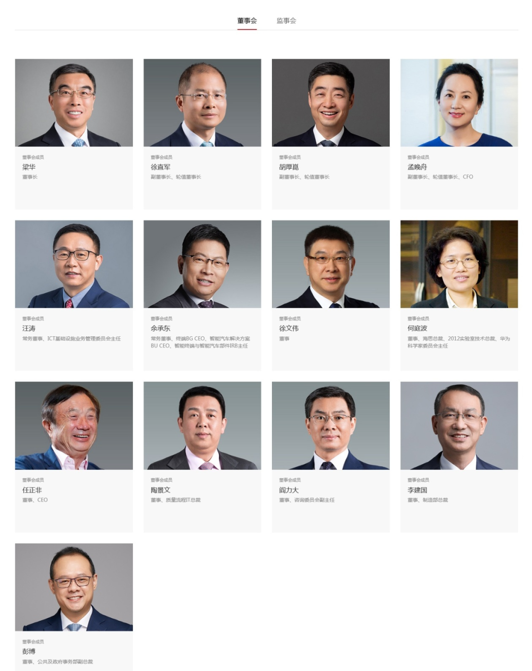 据华为官网介绍,董事会是公司战略、经营管理和客户满意度的最高责任机构。华为在治理层实行集体领导,董事会及董事会常务委员会由轮值董事长主持,轮值董事长的轮值期为六个月。