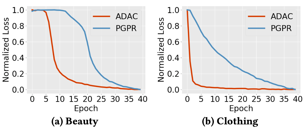 比较 ADAC 在 Beauty 和 Clothing 数据集上的收敛性可以看到,ADAC 通过有效利用示例路径在路径级别和元路径级别的信息实现了高效地收敛。