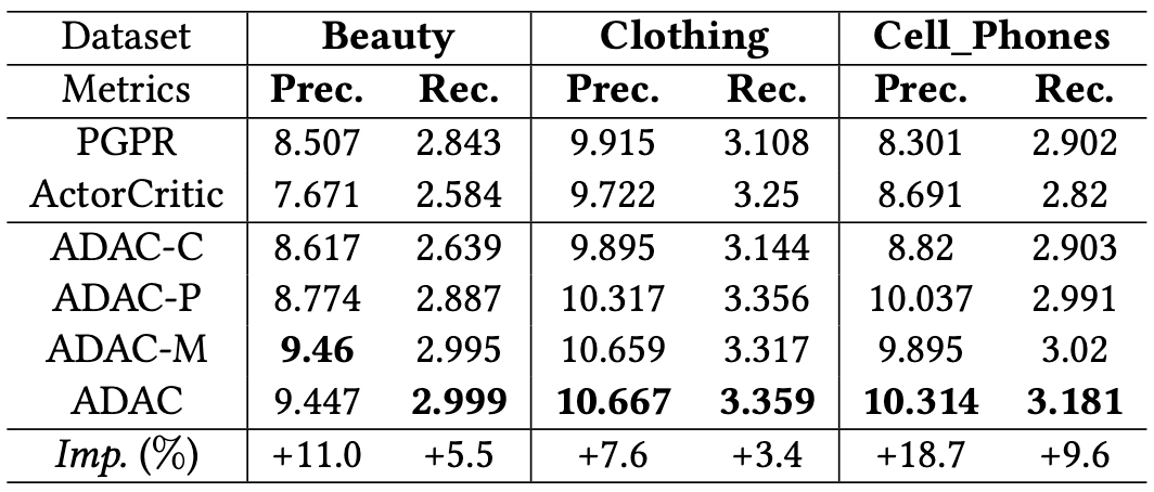 我们在亚马逊三种不同的物品类别上验证了提出的模型:Beauty(美妆产品)、Clothing Shoes and Jewelry(服饰鞋帽)和 Cell Phones and Accessories(手机及配件)。这里为了公平只用了最短路径得到示例(没有额外人工标注)。实验结果表明,与基线方法相比,Actor-Critic 方法在推荐准确性方面取得了更好的结果。