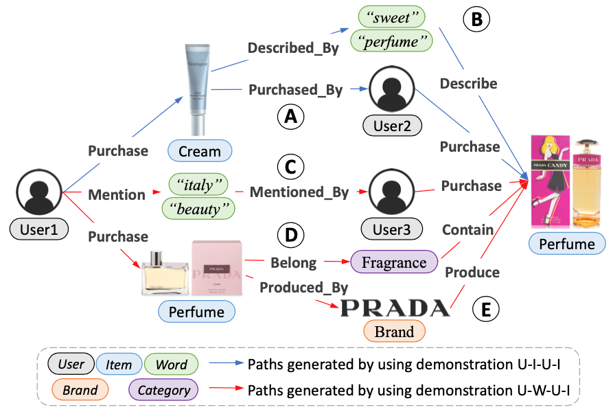 兴趣路径。一个更具解释力的推理路径应当在实体级别符合用户的兴趣,比如路径中包含用户感兴趣的实体。在一些数据集中,得到实体级别的用户兴趣相对比较容易。例如,在包含用户评论的数据集中,可以通过查找实体是否出现在用户的评论中,来自动判断路径上的实体是否符合用户的兴趣(P1)。在这种情况下,使用随机游走得到一组路径,并查看每条路径中的实体是否多数符合用户兴趣,并仅保留那些符合用户兴趣的路径(P2),同时,去除那些没有将用户与其交互过的物品连接起来的路径,以保证准确性(P3),并将剩余路径作为示例路径。