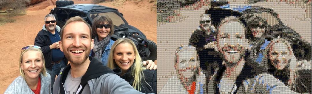 找一张目标照片,比如说一张全家福。你可以使用以其他图像作为图案块的“codebook”算法重新创建目标图像作为马赛克。如果你能够智能地搜索并选择图案块集中最好的“codebook”算法图片,你就可以任意地对目标图片进行更好的重建。