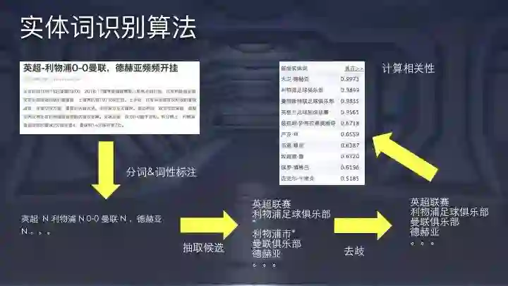 上图是一个实体词识别算法的case。基于分词结果和词性标注选取候选,期间可能需要根据知识库做一些拼接,有些实体是几个词的组合,要确定哪几个词结合在一起能映射实体的描述。如果结果映射多个实体还要通过词向量、topic分布甚至词频本身等去歧,最后计算一个相关性模型。
