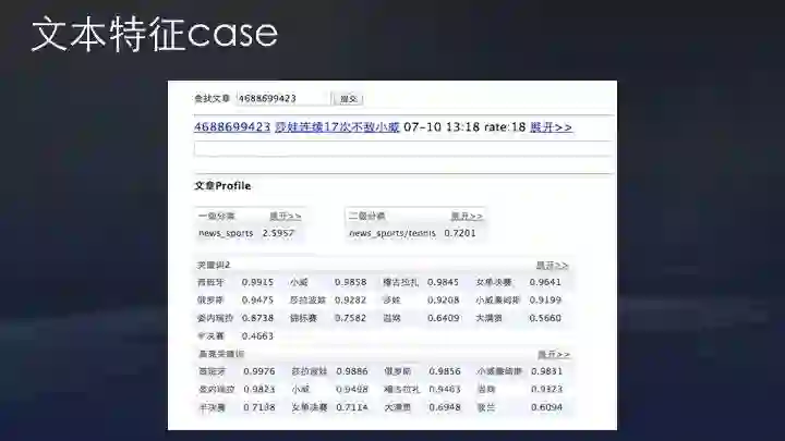 上图是今日头条的一个实际文本case。可以看到,这篇文章有分类、关键词、topic、实体词等文本特征。当然不是没有文本特征,推荐系统就不能工作,推荐系统最早期应用在Amazon,甚至沃尔玛时代就有,包括Netfilx做视频推荐也没有文本特征直接协同过滤推荐。但对资讯类产品而言,大部分是消费当天内容,没有文本特征新内容冷启动非常困难,协同类特征无法解决文章冷启动问题。