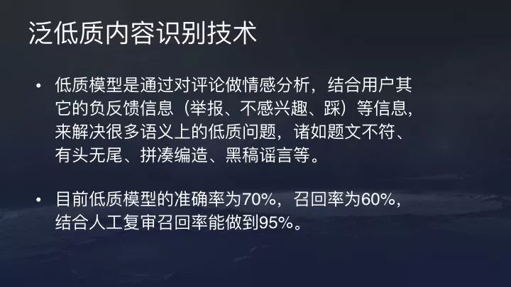 泛低质识别涉及的情况非常多,像假新闻、黑稿、题文不符、标题党、内容质量低等等,这部分内容由机器理解是非常难的,需要大量反馈信息,包括其他样本信息比对。目前低质模型的准确率和召回率都不是特别高,还需要结合人工复审,将阈值提高。目前最终的召回已达到95%,这部分其实还有非常多的工作可以做。头条人工智能实验室李航老师目前也在和密歇根大学共建科研项目,设立谣言识别平台。