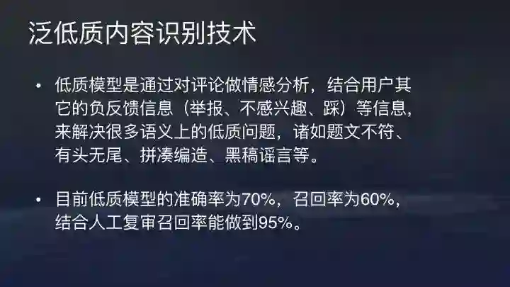 分享内容识别技术主要鉴黄模型,谩骂模型以及低俗模型。今日头条的低俗模型通过深度学习算法训练,样本库非常大,图片、文本同时分析。这部分模型更注重召回率,准确率甚至可以牺牲一些。谩骂模型的样本库同样超过百万,召回率高达95%+,准确率80%+。如果用户经常出言不讳或者不当的评论,我们有一些惩罚机制。