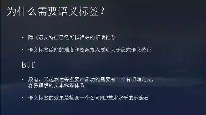 目前,隐式语义特征已经可以很好的帮助推荐,而语义标签需要持续标注,新名词新概念不断出现,标注也要不断迭代。其做好的难度和资源投入要远大于隐式语义特征,那为什么还需要语义标签?有一些产品上的需要,比如频道需要有明确定义的分类内容和容易理解的文本标签体系。语义标签的效果是检查一个公司NLP技术水平的试金石。