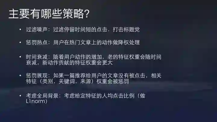 当然最简单的用户标签是浏览过的内容标签。但这里涉及到一些数据处理策略。主要包括:一、过滤噪声。通过停留时间短的点击,过滤标题党。二、热点惩罚。对用户在一些热门文章(如前段时间PG One的新闻)上的动作做降权处理。理论上,传播范围较大的内容,置信度会下降。三、时间衰减。用户兴趣会发生偏移,因此策略更偏向新的用户行为。因此,随着用户动作的增加,老的特征权重会随时间衰减,新动作贡献的特征权重会更大。四、惩罚展现。如果一篇推荐给用户的文章没有被点击,相关特征(类别,关键词,来源)权重会被惩罚。当然同时,也要考虑全局背景,是不是相关内容推送比较多,以及相关的关闭和dislike信号等。