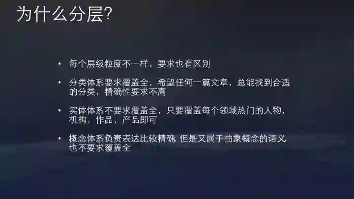 分类的目标是覆盖全面,希望每篇内容每段视频都有分类;而实体体系要求精准,相同名字或内容要能明确区分究竟指代哪一个人或物,但不用覆盖很全。概念体系则负责解决比较精确又属于抽象概念的语义。这是我们最初的分类,实践中发现分类和概念在技术上能互用,后来统一用了一套技术架构。