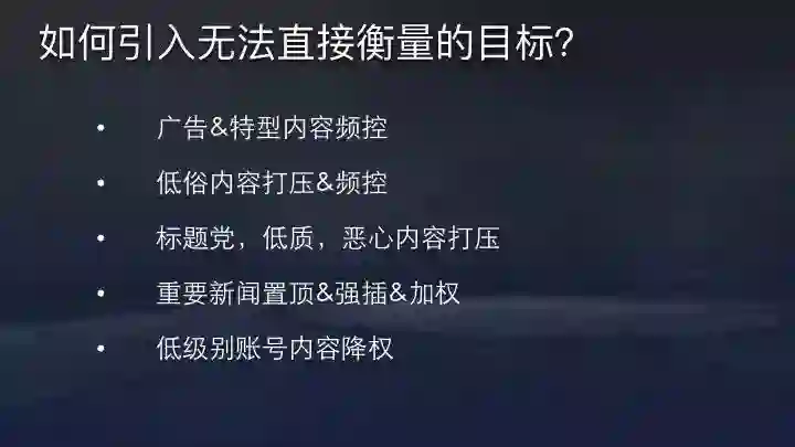 此外,平台出于内容生态和社会责任的考量,像低俗内容的打压,标题党、低质内容的打压,重要新闻的置顶、加权、强插,低级别账号内容降权都是算法本身无法完成,需要进一步对内容进行干预。