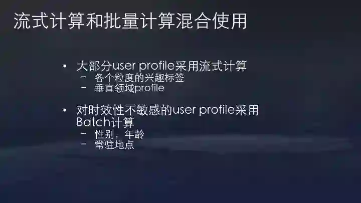 当然,我们也发现并非所有用户标签都需要流式系统。像用户的性别、年龄、常驻地点这些信息,不需要实时重复计算,就仍然保留daily更新。
