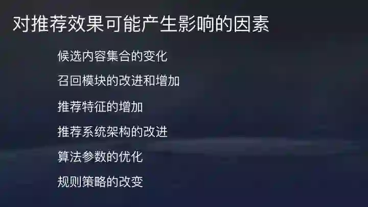事实上,很多因素都会影响推荐效果。比如侯选集合变化,召回模块的改进或增加,推荐特征的增加,模型架构的改进在,算法参数的优化等等,不一一举例。评估的意义就在于,很多优化最终可能是负向效果,并不是优化上线后效果就会改进。