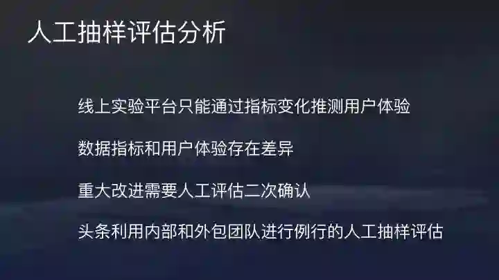 当然,只有实验平台是远远不够的。线上实验平台只能通过数据指标变化推测用户体验的变化,但数据指标和用户体验存在差异,很多指标不能完全量化。很多改进仍然要通过人工分析,重大改进需要人工评估二次确认。