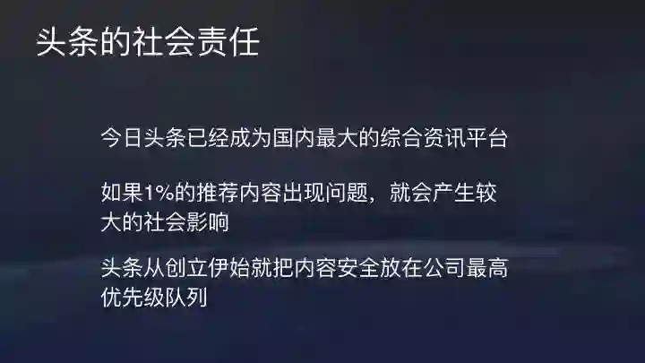最后要介绍今日头条在内容安全上的一些举措。头条现在已经是国内最大的内容创作与分发凭条,必须越来越重视社会责任和行业领导者的责任。如果1%的推荐内容出现问题,就会产生较大的影响。