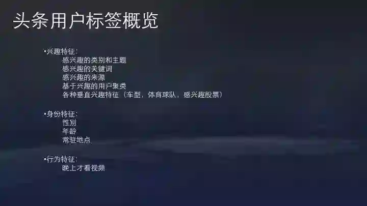 今日头条常用的用户标签包括用户感兴趣的类别和主题、关键词、来源、基于兴趣的用户聚类以及各种垂直兴趣特征(车型,体育球队,股票等)。还有性别、年龄、地点等信息。性别信息通过用户第三方社交账号登录得到。年龄信息通常由模型预测,通过机型、阅读时间分布等预估。常驻地点来自用户授权访问位置信息,在位置信息的基础上通过传统聚类的方法拿到常驻点。常驻点结合其他信息,可以推测用户的工作地点、出差地点、旅游地点。这些用户标签非常有助于推荐。