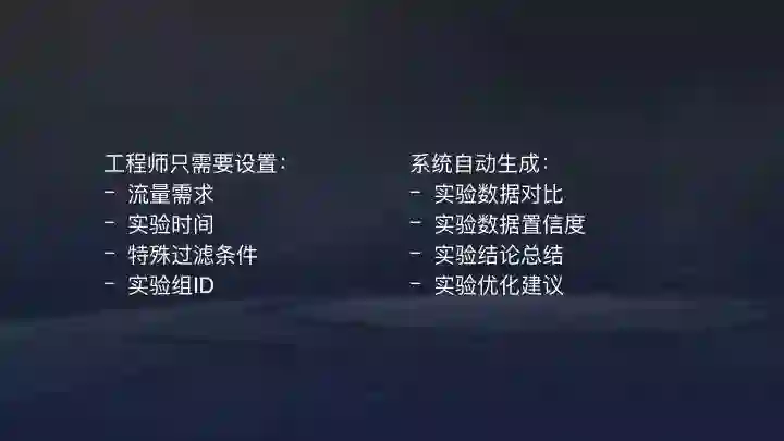 在这个系统下工程师只需要设置流量需求、实验时间、定义特殊过滤条件,自定义实验组ID。系统可以自动生成:实验数据对比、实验数据置信度、实验结论总结以及实验优化建议。