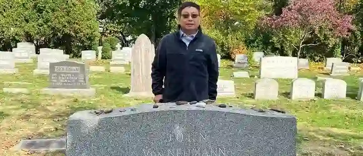 当我们在冯诺伊曼的墓碑前照相时,身后突然冒出一个美国人,问我:「你们在这干什么?」我说:「我们来向冯诺伊曼致敬。」他说:「我住在冯诺伊曼家。」我惊奇地问:「你是他儿子?」他说:「不是。我爸爸在我六岁时买了冯诺伊曼的房子。我在那个房子里住了66年。」