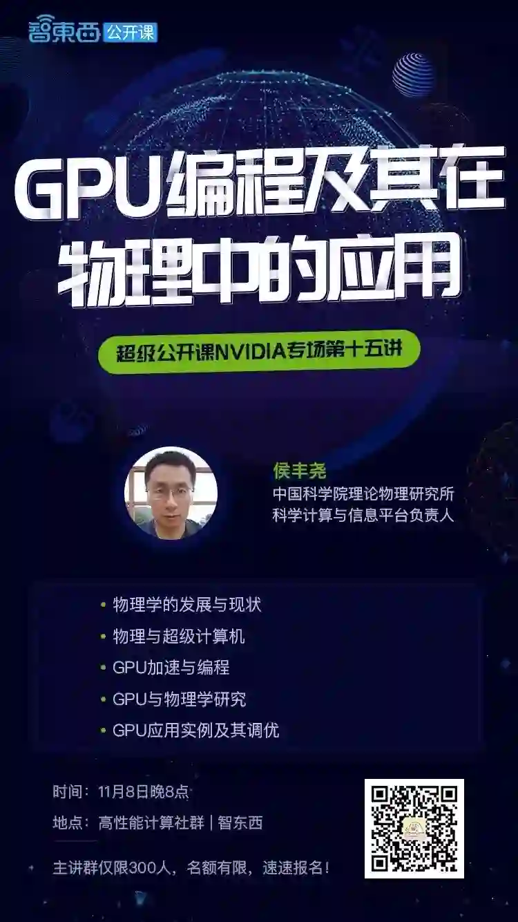 “计算物理”已经发展成一个专门的分支学科,GPU为代表的加速技术在其中如何发挥作用呢?周四晚8点,中国科学院理论物理研究所科学计算与信息平台负责人侯丰尧将主讲GPU编程在物理中的应用!