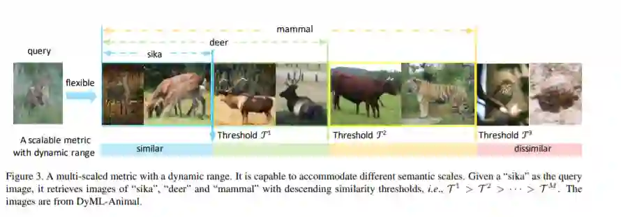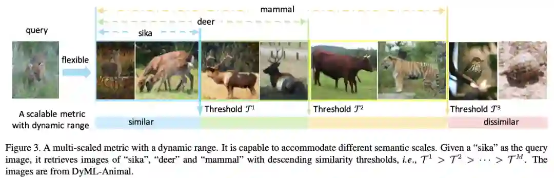该工作将度量学中一个重要的属性“动态范围”引入到深度度量学习,从而得到一个新的任务叫做“动态度量学习”。我们发现,以往的深度度量其实只蕴含一个刻度,例如仅仅区分人脸、行人是相似还是不相似。这样的量具无论多精确,在实际使用中都是灵活不足、用途有限的。实际上,我们日常的量具通常具有动态范围,例如尺子总是有多个刻度(例如1mm、1cm乃至10cm)来测量不同尺度的物体。我们认为,深度度量学习领域已经到了需要引入动态范围的时候了。因为,视觉概念本身就有着不同的大小,“动物”、“植物”都对应大尺度,而“麋鹿”却对应相对较小的尺度。在小尺度下,两只麋鹿可能看上去很不一样,但是在另一个大尺度下,同样两只麋鹿却应该被认为非常相似。