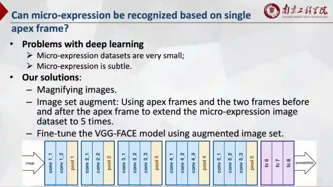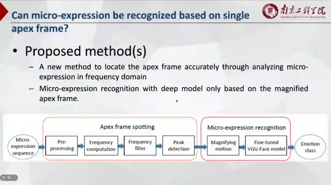 在结合深度学习方法的部分,由于基于视频的微表情识别研究受到样本数目少的限制,存在严重过拟合的情况,黄晓华教授及其团队探索了基于微表情峰值帧和结合深度学习的识别方法。首先通过在频域对微表情片段进行分析,得到该片段中微表情动作的峰值帧,在放大等预处理后,通过VGG-Face模型进行微表情的情感分类。