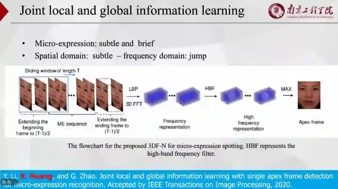 其次,黄晓华教授介绍了他们团队最新的工作:结合局部和全局信息学习的微表情识别方法。首先提出了基于3D频域的微表情峰值帧检测方法,提升了峰值帧检测的准确率。